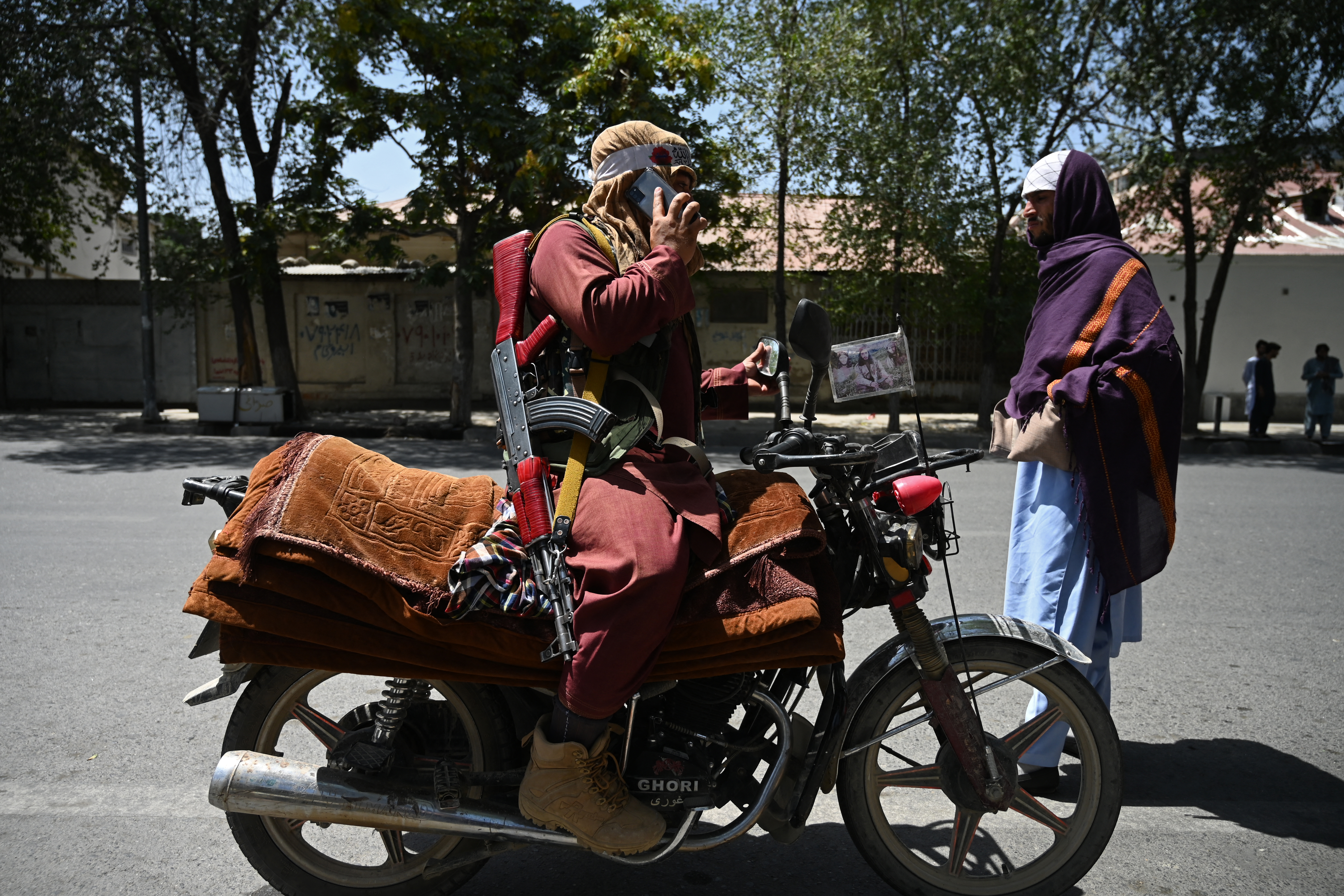 A Taliban fighter sits on his motorcycle along a roadside at Shahr-e-Naw in Kabul. [Wakil Kohsar/AFP]