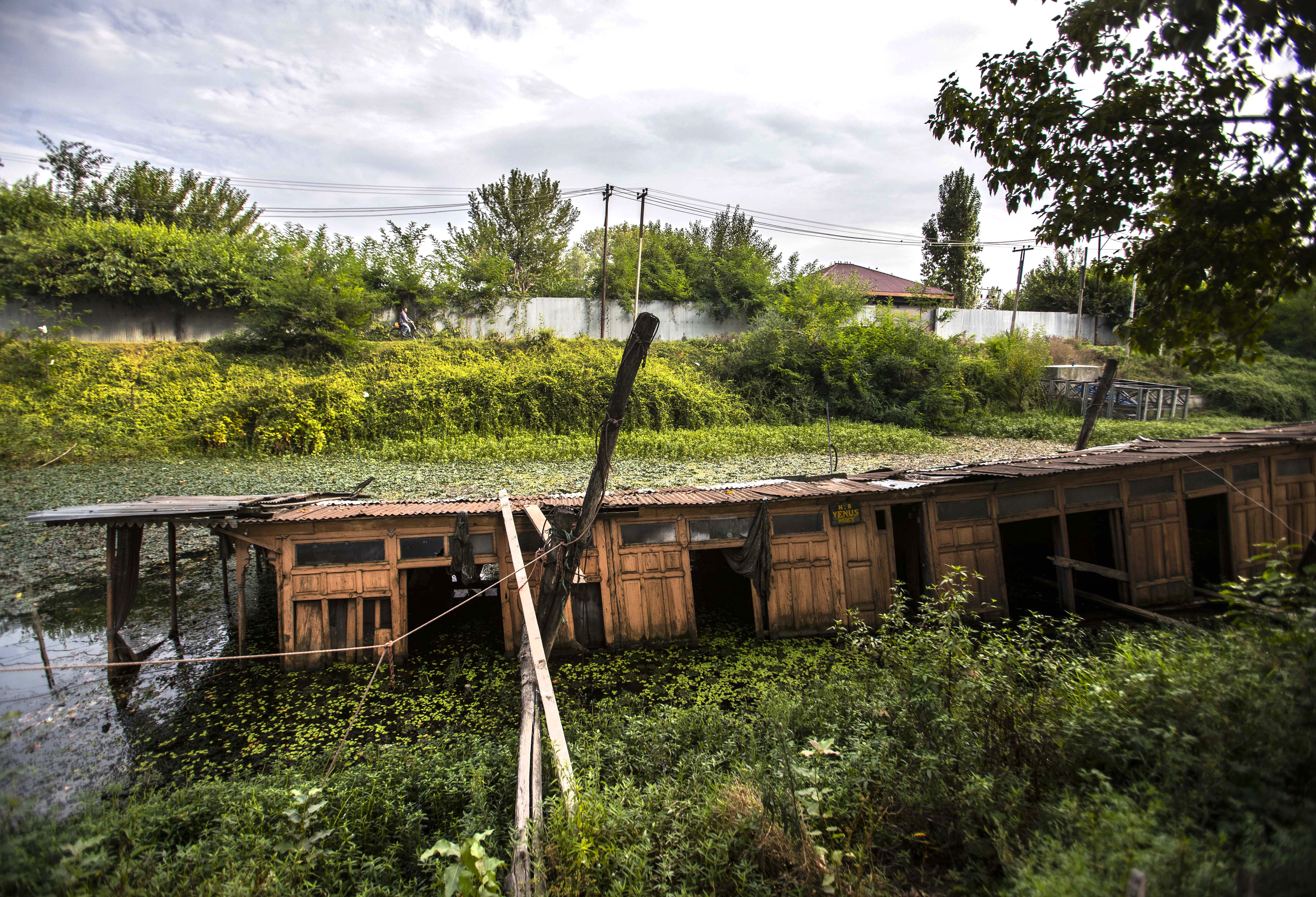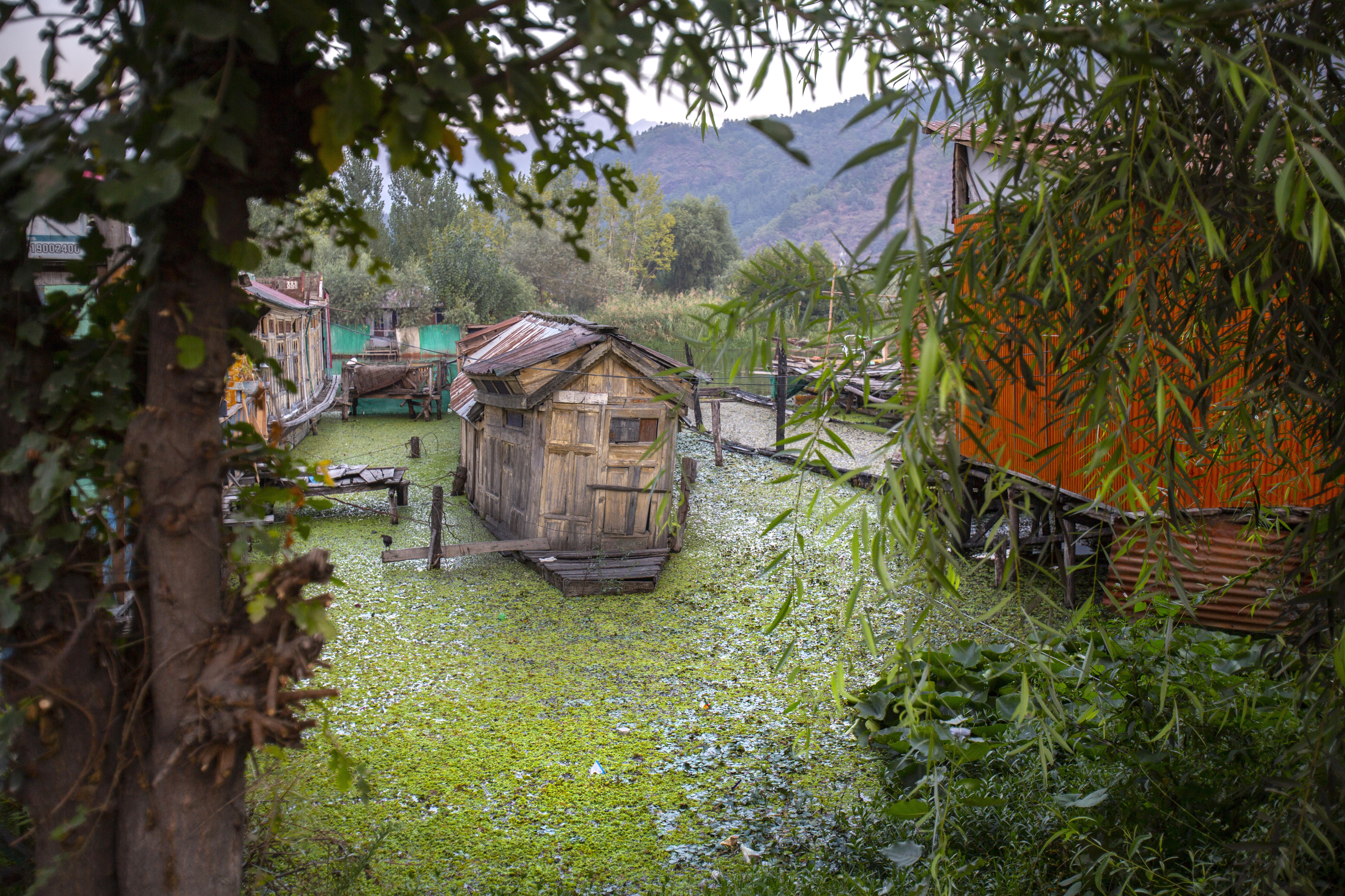 Boatman Noor Muhammad struggles to row as his boat moves deep into the famed Dal Lake in Srinagar, the main city in Indian-administered Kashmir. He presses hard on his oar to untangle the vessel from thick vegetation.