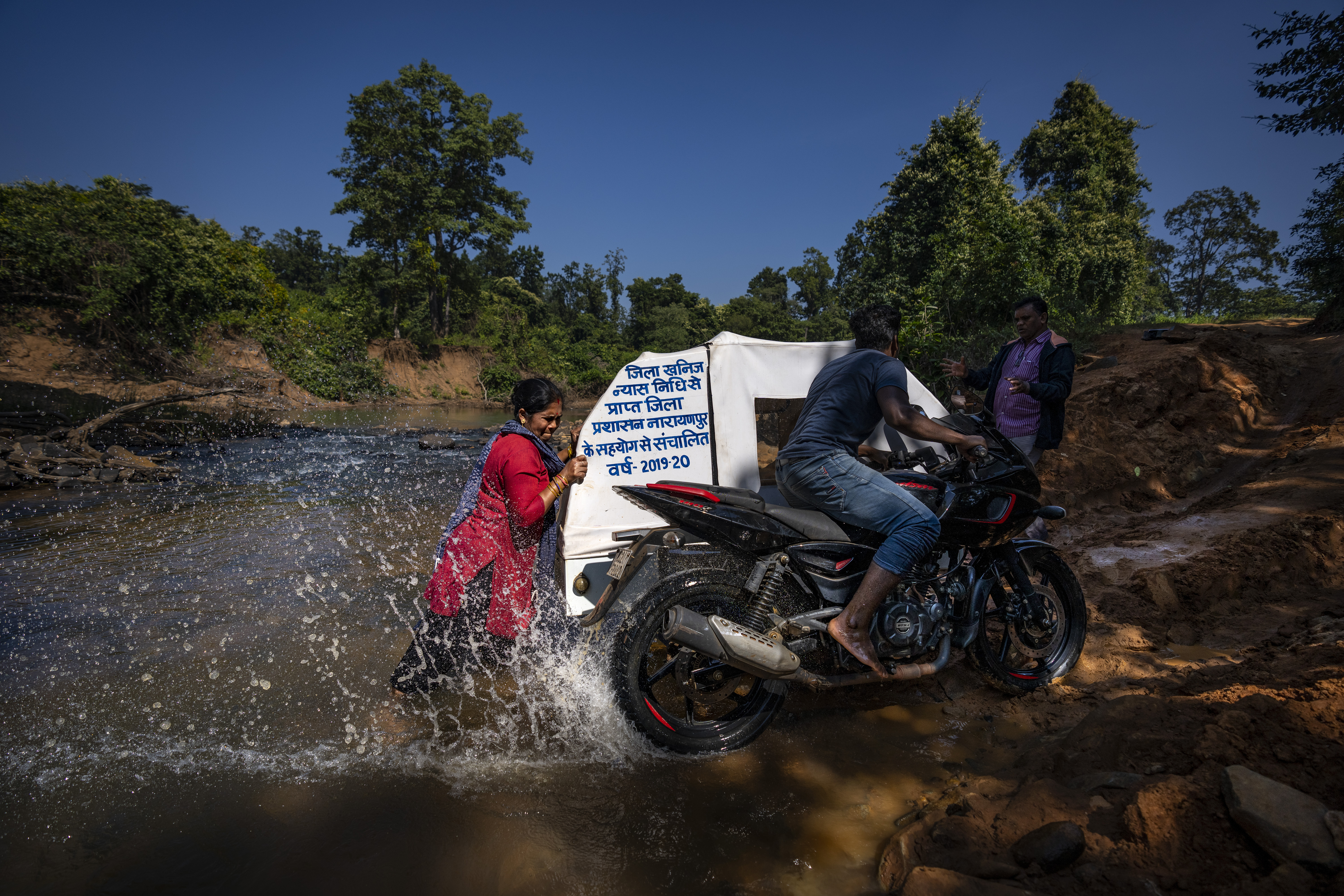 After 40 minutes of digging and a push to lift the vehicle from the river bed onto the muddy path, the team was on its way again. The bike ambulance resumed its 14.5km (9-mile) trek across the forest known as Abhujmarh, or the “Unknown Hills”, to reach 23-year-old Phagni Poyam, nine months pregnant in the isolated village of Kodoli.
