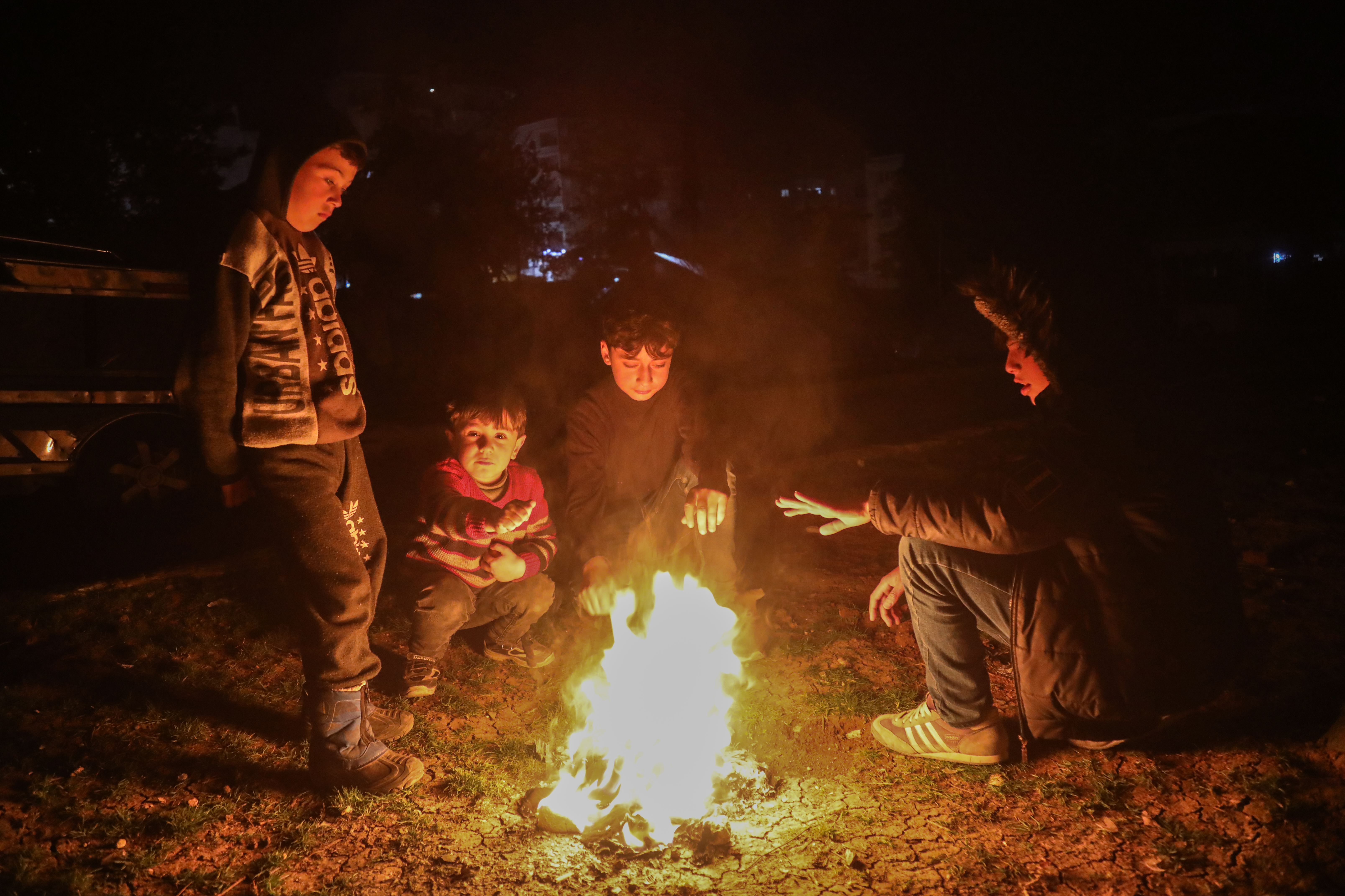 Children try to keep warm as they spend the night in a park in the northwestern Syrian city of Idlib. [Ali Haj Suleiman/Al Jazeera]