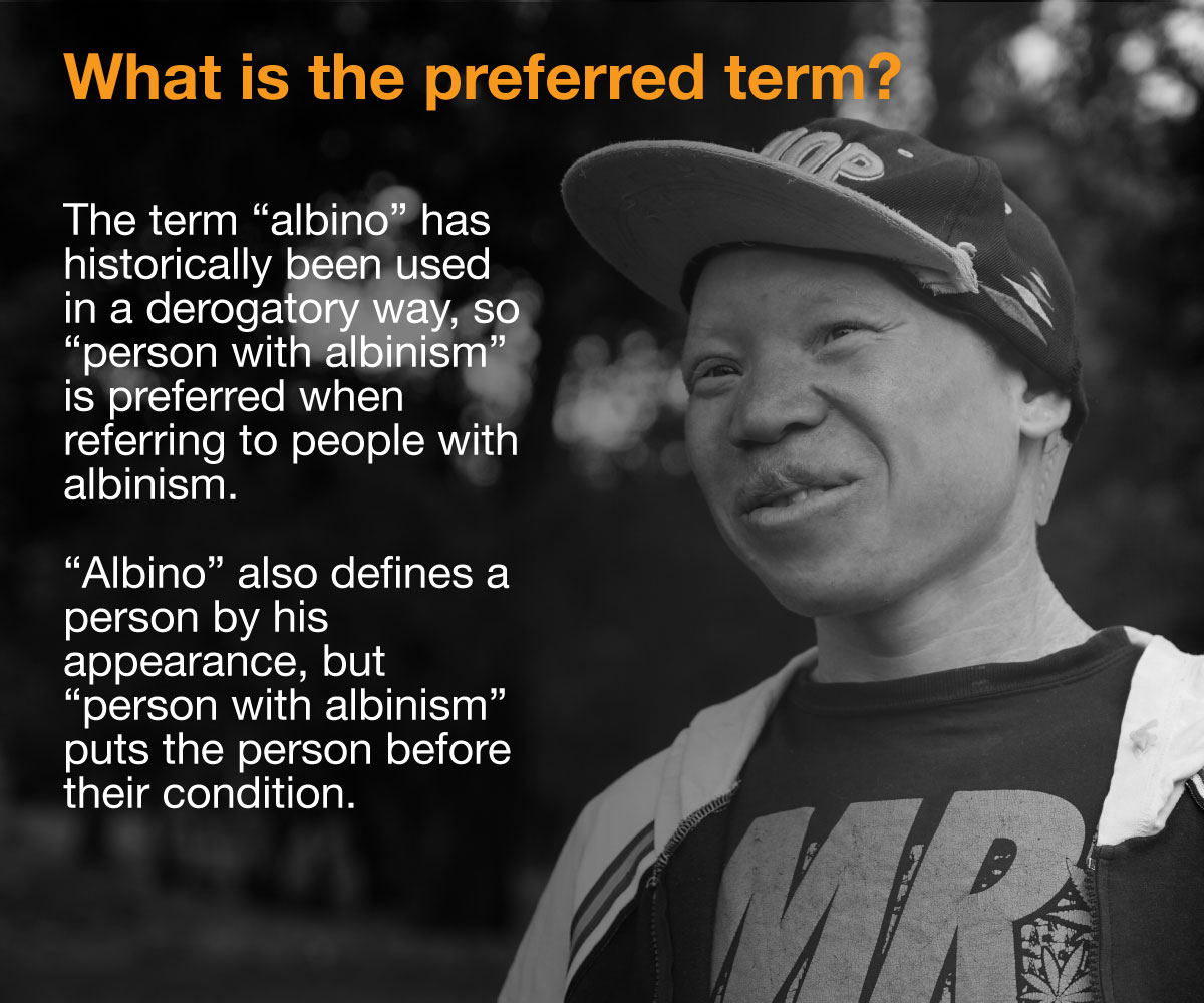 The term “albino” has historically been used in a derogatory manner, so “person with albinism” is preferred when referring to people with albinism. “Albino” also defines a person by his appearance, but “person with albinism” puts the person before their condition.