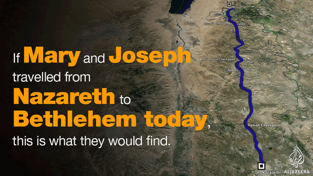 Mary and Joseph would have to pass through Israeli checkpoints, occupied land, illegal settlements and separation wall.