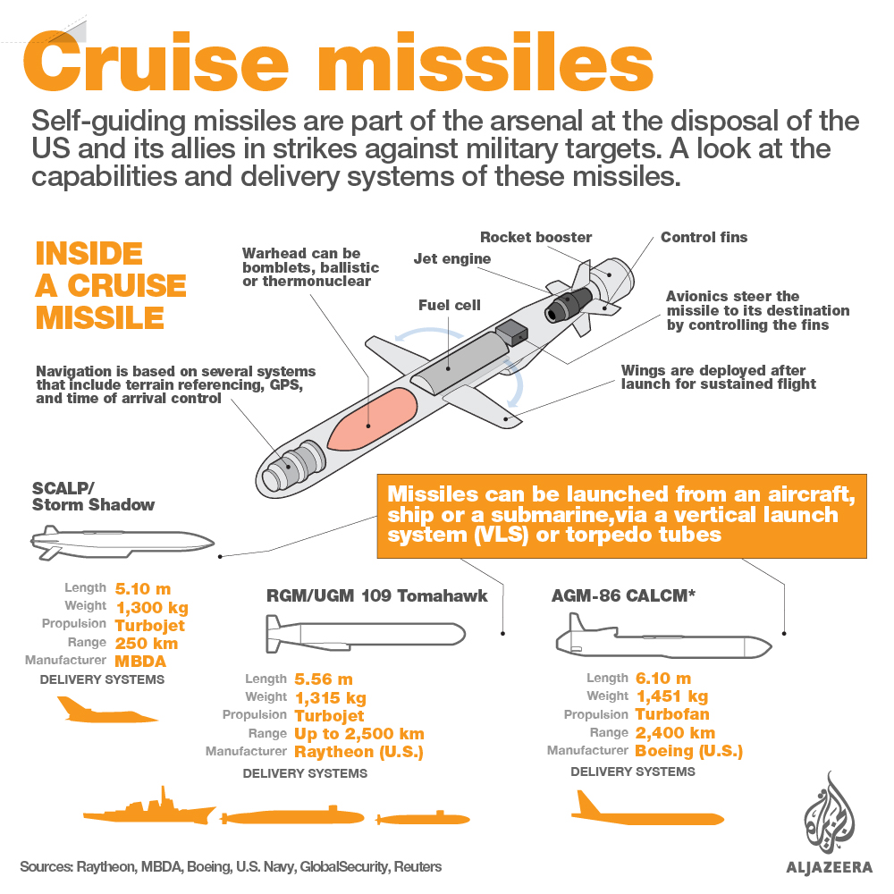 The Pentagon said 59 Tomahawk cruise missiles were fired from two warships in the Mediterranean at the Shayrat airfield in Homs province, targeting the base from where US officials believe Tuesday’s attack in Khan Sheikhoun had been launched.