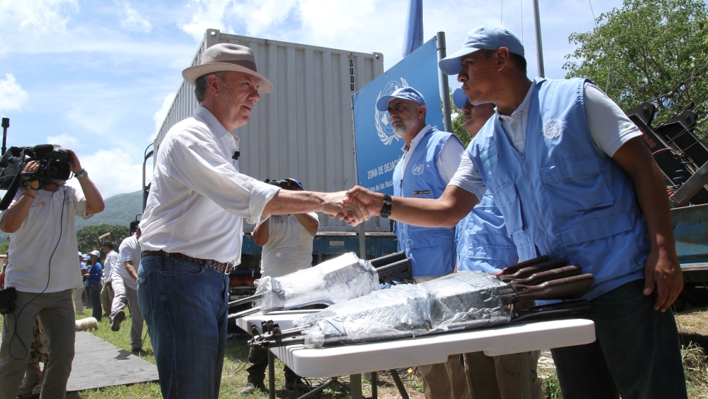 Santos himself shut a padlock on the last lot of decommissioned rifles before it was taken out of a remote demobilisation camp to formally seal the UN-supervised disarmament by the Revolutionary Armed Forces of Colombia (FARC).
