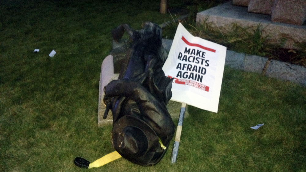 US anti-hate demonstrators topple Confederate statue