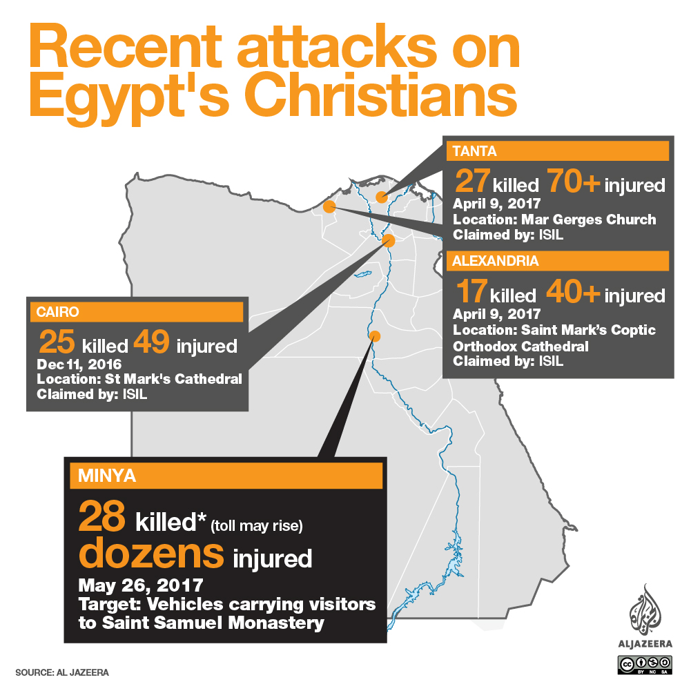 The Christians were headed on May 26 to the Saint Samuel Monastery, located outside Minya city – about 220km south of the capital Cairo – when masked attackers in three pickup trucks opened fire on them before fleeing the scene. There was no immediate claim of responsibility.