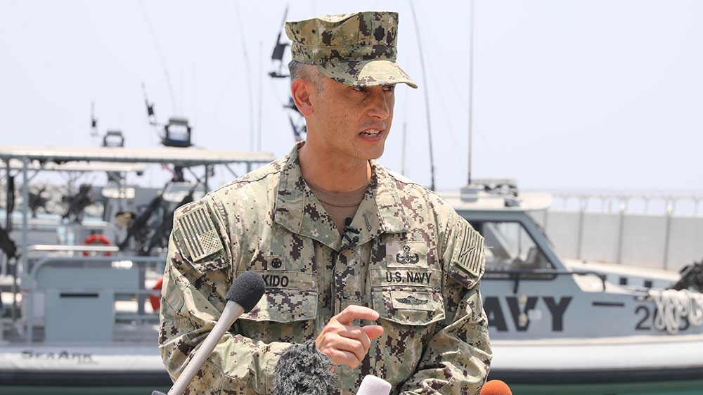 In a picture taken during a guided tour by the US Navy, Commander Sean Kido, Commanding Officer of Task Group 56.1, speaks during a press briefing at a UAE Naval facility near the port of Fujairah [AFP]