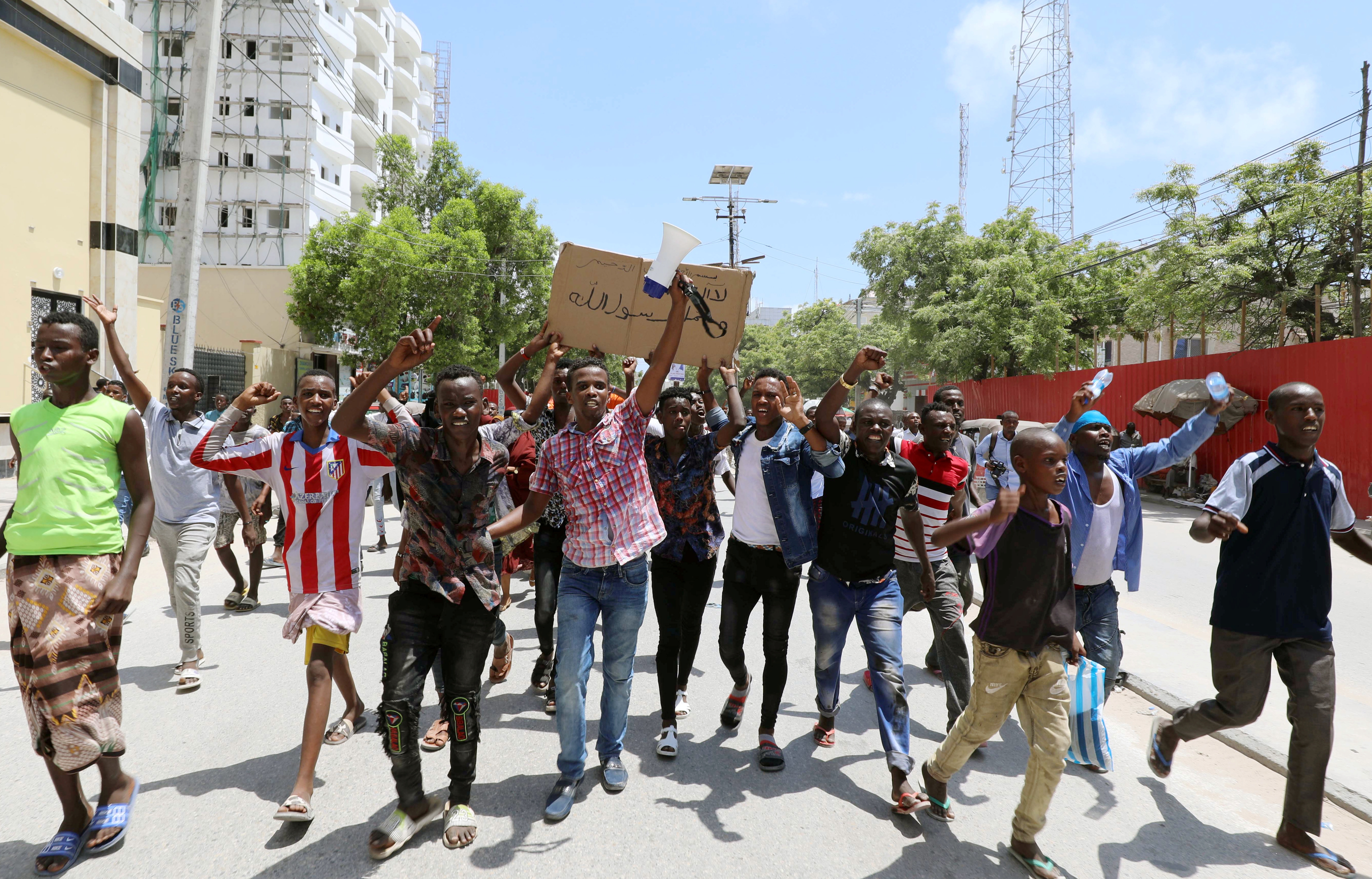Several hundred demonstrators blocked traffic in street protests in the capital Mogadishu, chanting slogans and burning effigies of Macron whose defence of the right to mock religion has ignited anger in much of the Muslim world.