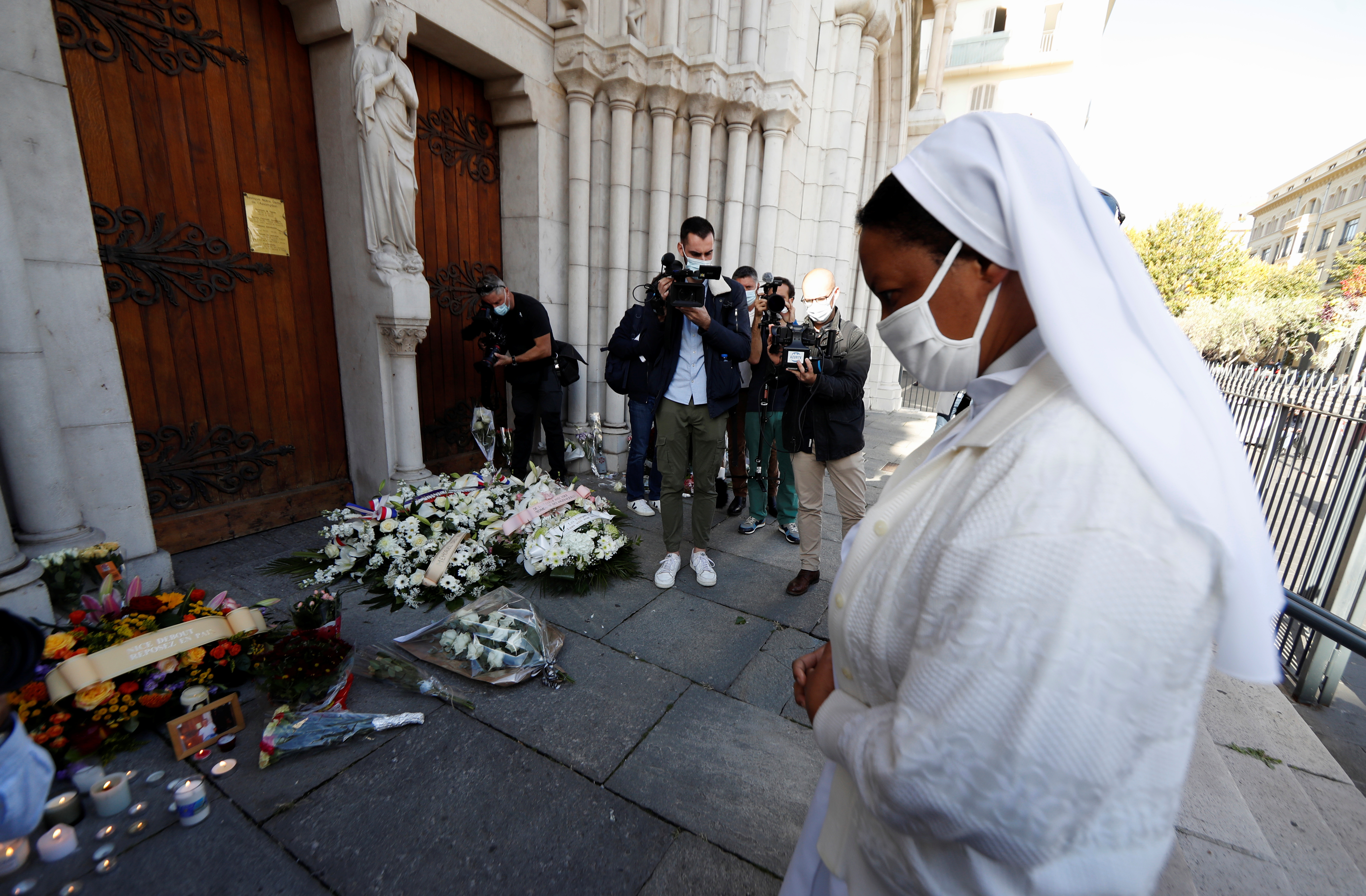 In Nice, a makeshift memorial of flowers and candles was set up outside the basilica to honour the three victims.
