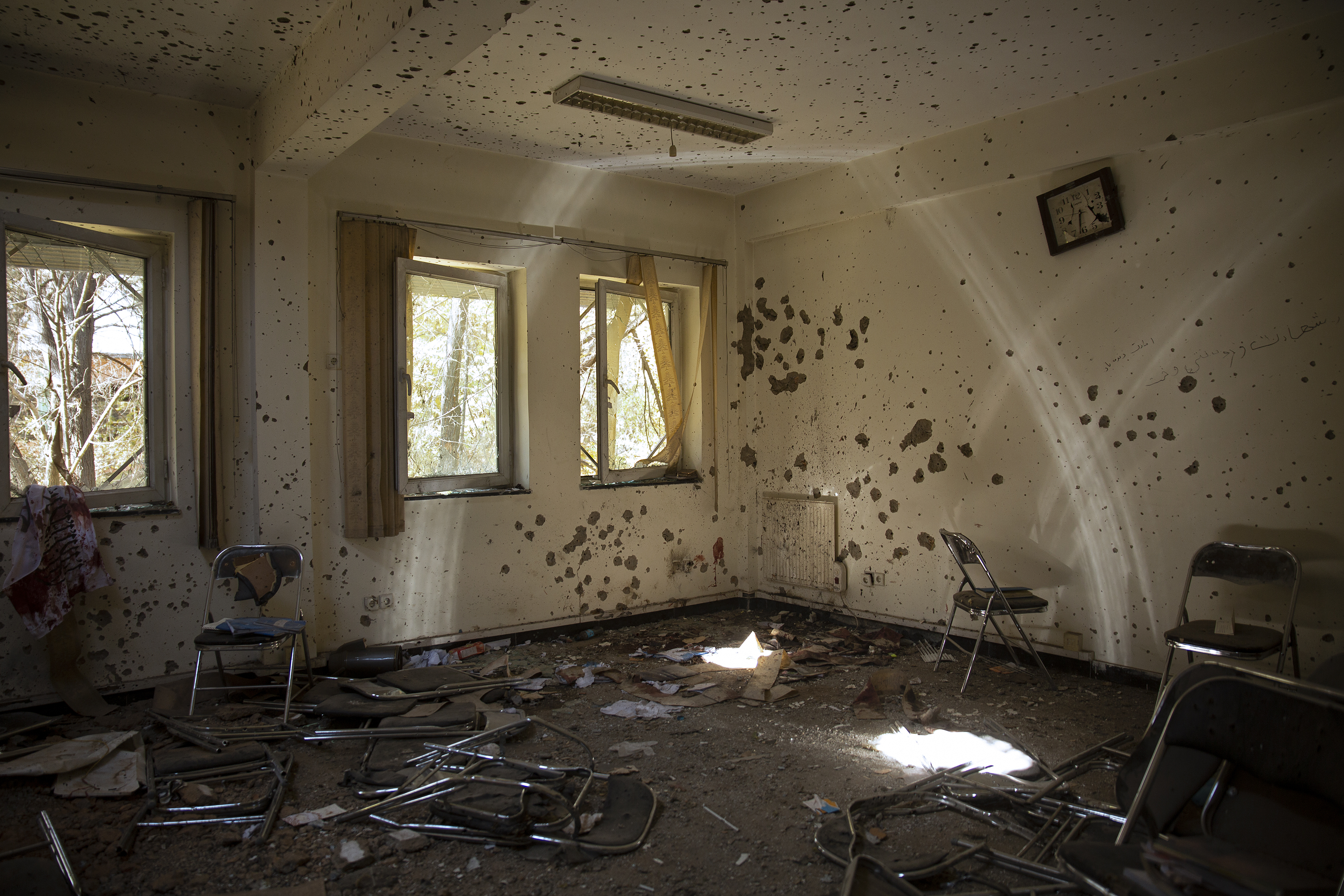 Though there was no evidence of large numbers of officials being killed and injured, the law faculty itself bore the signs of indiscriminate destruction. Classrooms with the day’s instruction still scrawled on the whiteboards were riddled with bullet holes.