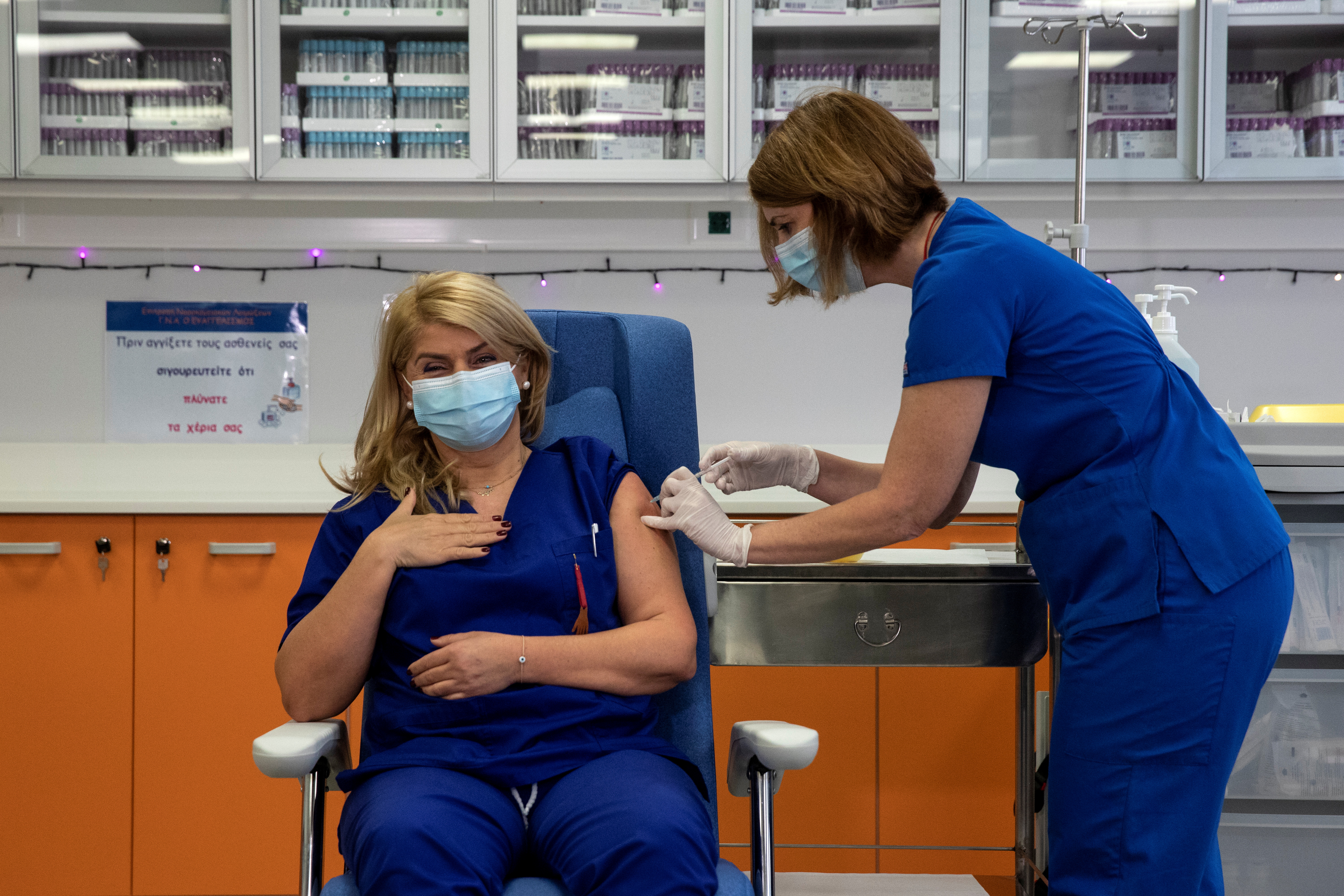 Efstathia Kambissiouli, head nurse at an intensive care unit, became the first person on December 27 to receive the Pfizer-BioNTech coronavirus vaccine.