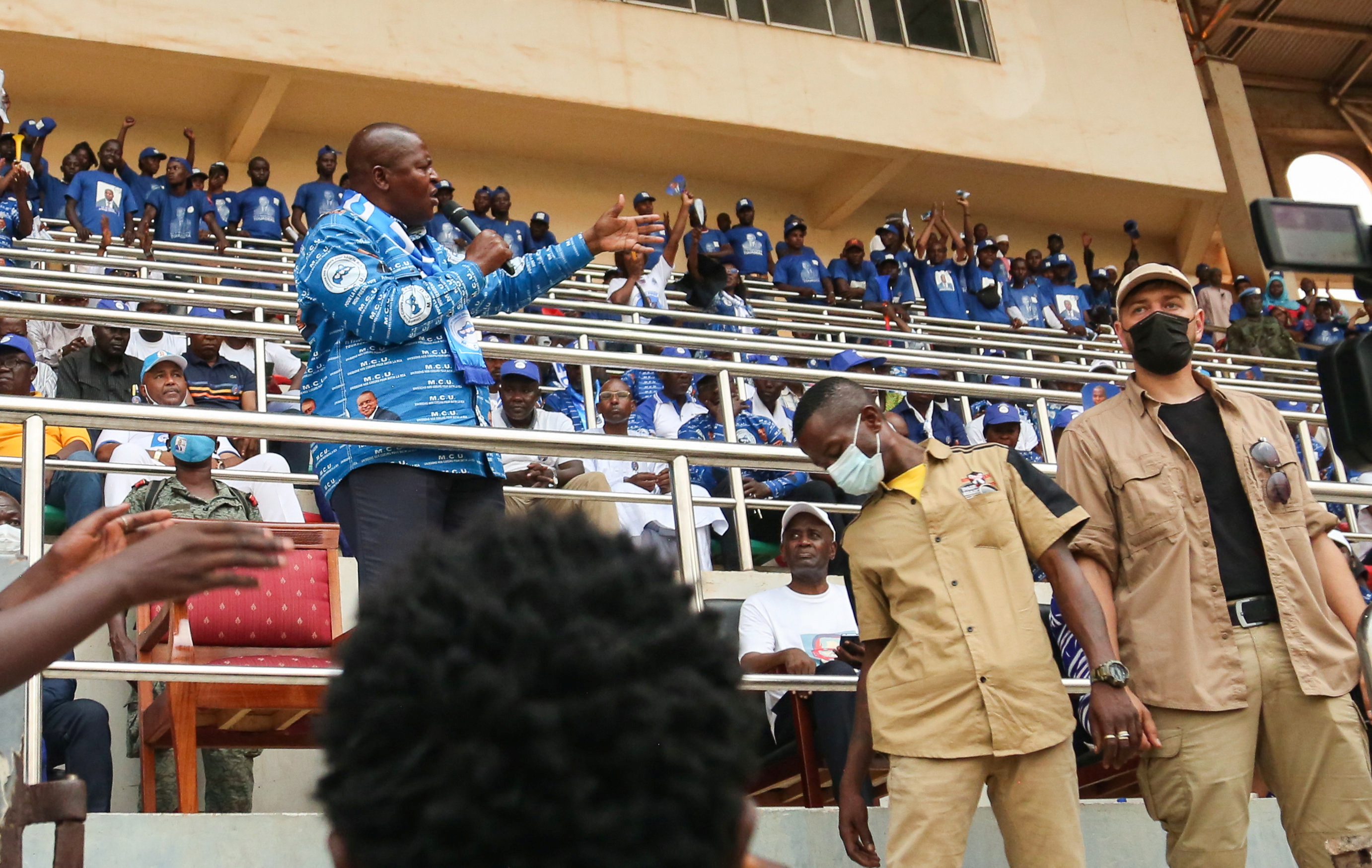 CAR's President Touadera addresses supporters at a rally as Russian mercenaries and Rwandan UN peacekeepers stand guard at a stadium in Bangui [Antonie Rolland/Reuters]