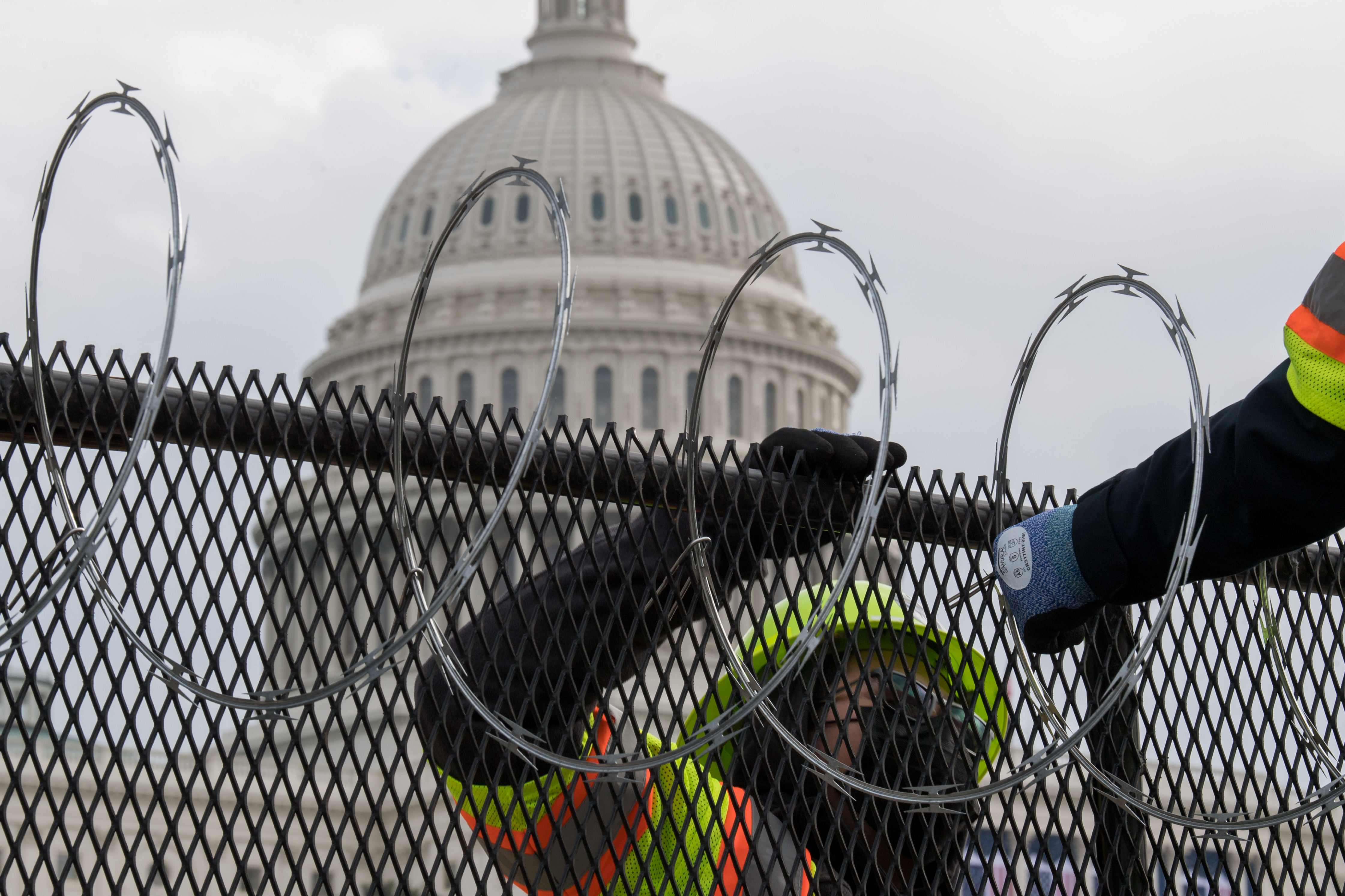 Washington, DC — Tall fences topped with thick, spiralling razor wire encased the US Capitol area on Friday, as thousands of heavily armed National Guardsmen stood watch. Bridges leading into the city will be closed beginning this weekend. Access to the grounds will be highly restricted.