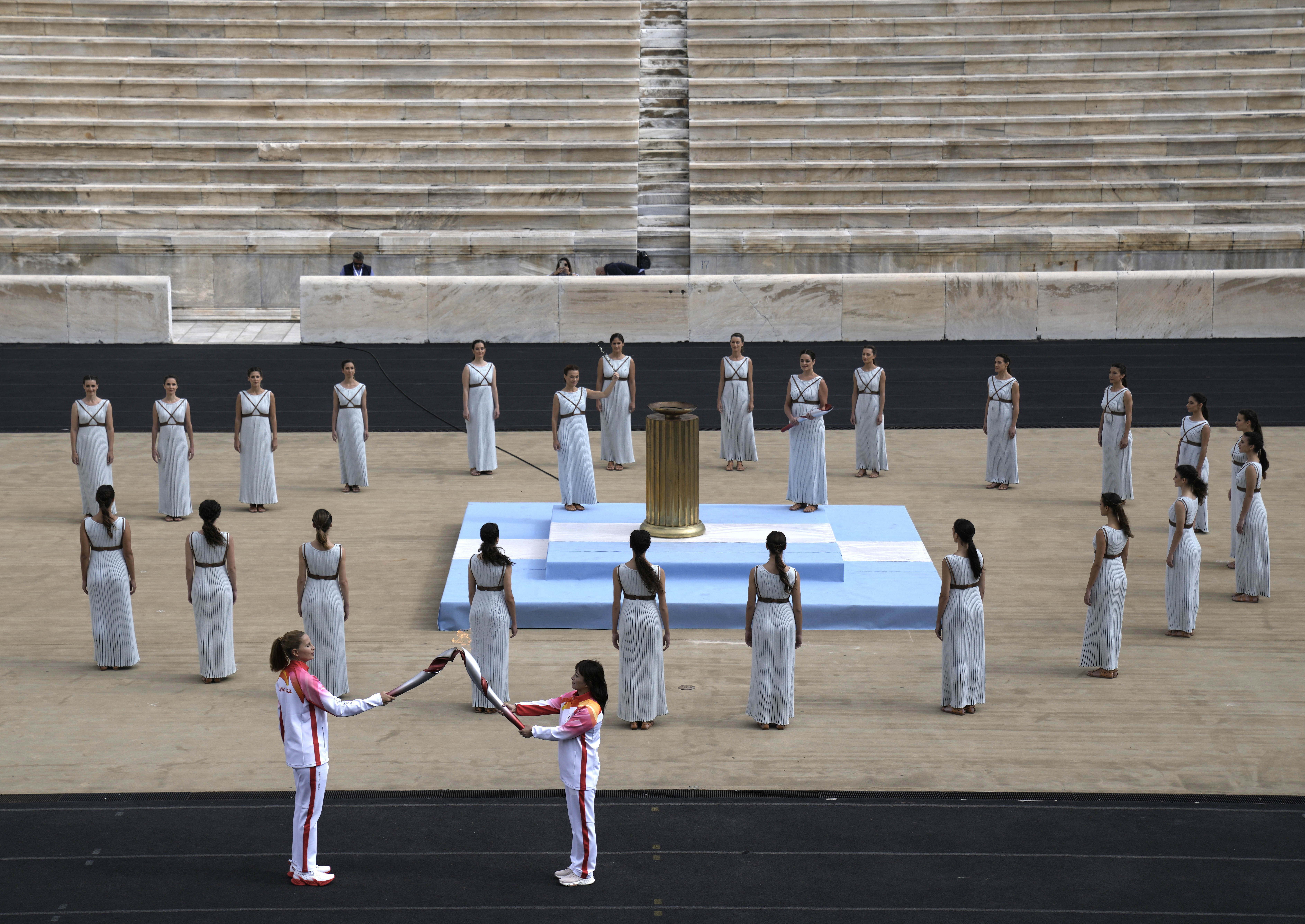 The flame had left Athens on Tuesday and travelled to Beijing in a red lantern designed in the likeness of a Han Dynasty tomb artefact, carried by torchbearers decked in white.