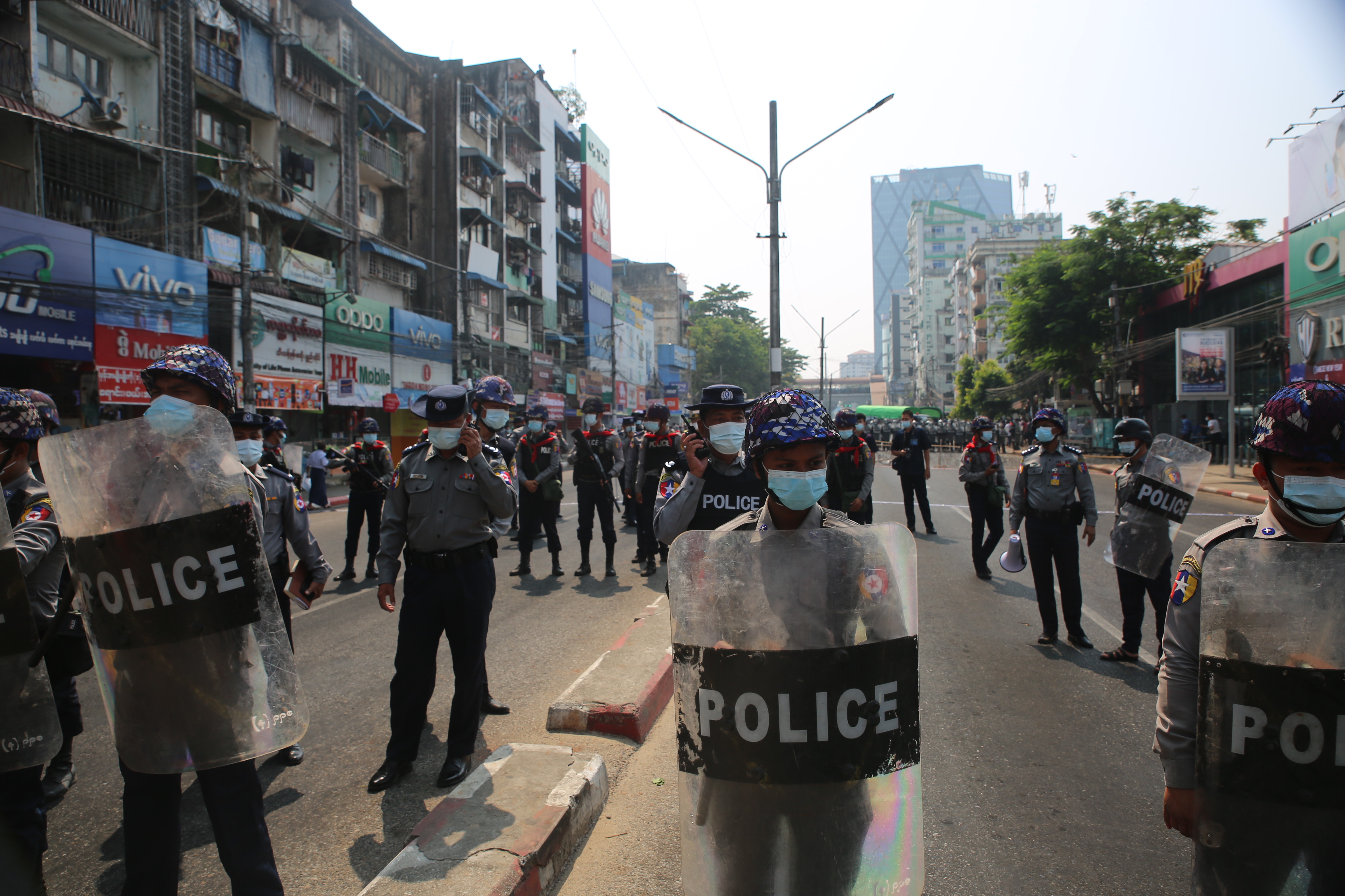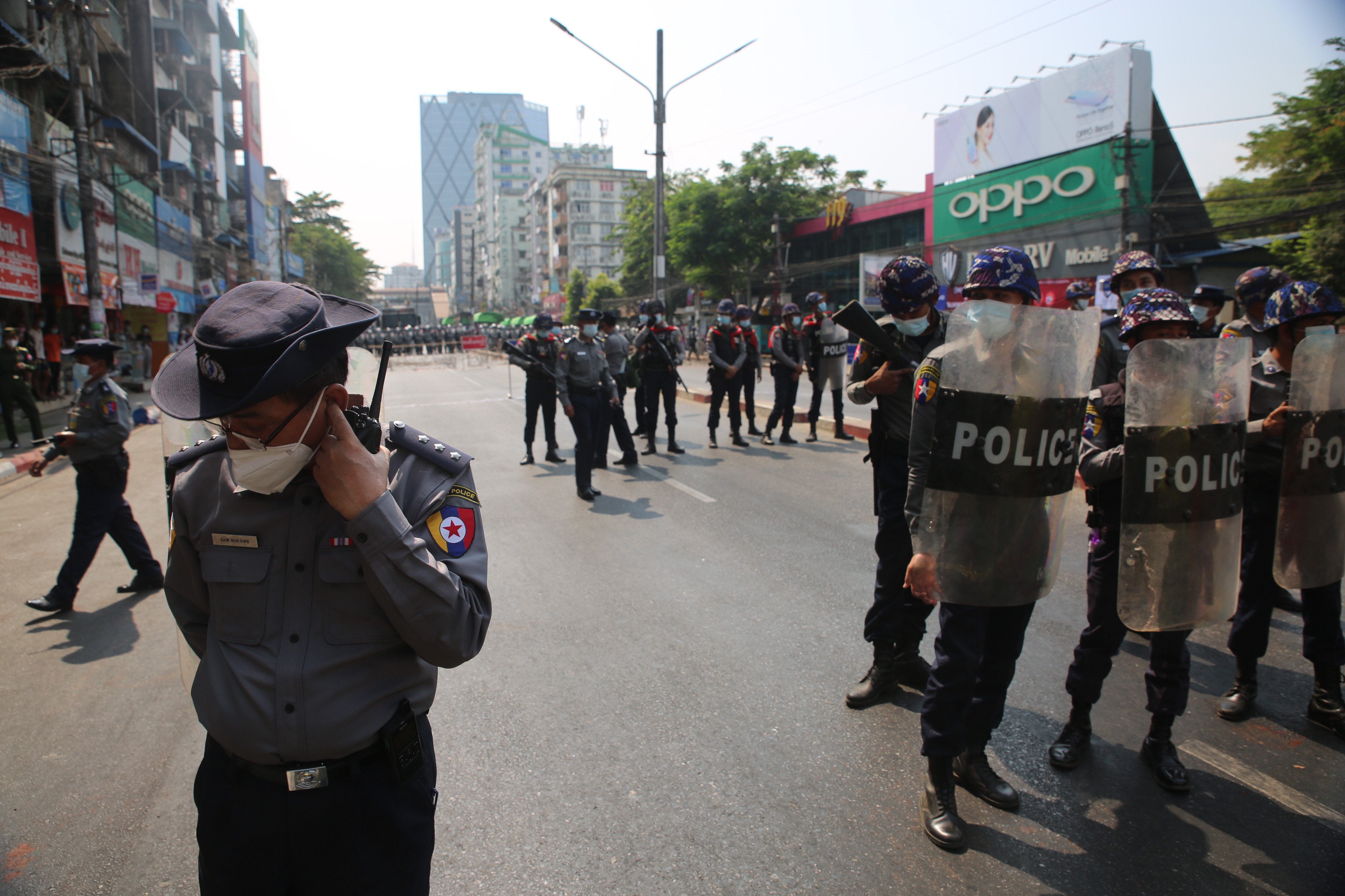 At the colonial-era City Hall in Myanmar’s largest city, hundreds were on the streets, with more police at hand and water cannon again on standby. Crowds were also forming elsewhere in the city, including the Hledan Center where youth activists have been demonstrating for the past three days.