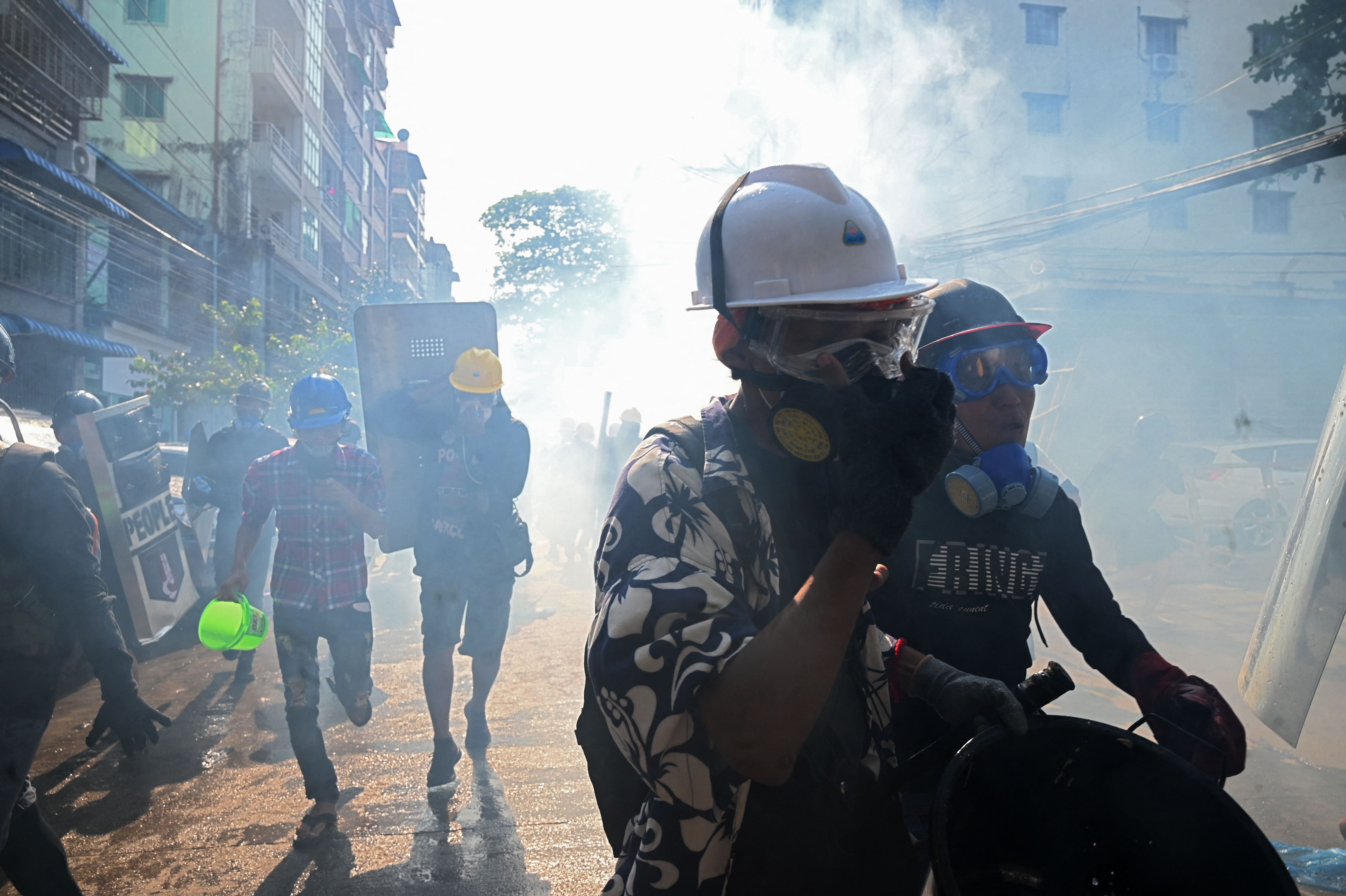 There were also tense scenes in the North Okkalapa area, where security forces surrounded protesters, in an echo of the military’s efforts on Monday night to barricade protesters into Sanchaung, also in Yangon. A live video stream showed people coughing and washing their faces after tear gas was deployed and there were reports of gunfire.