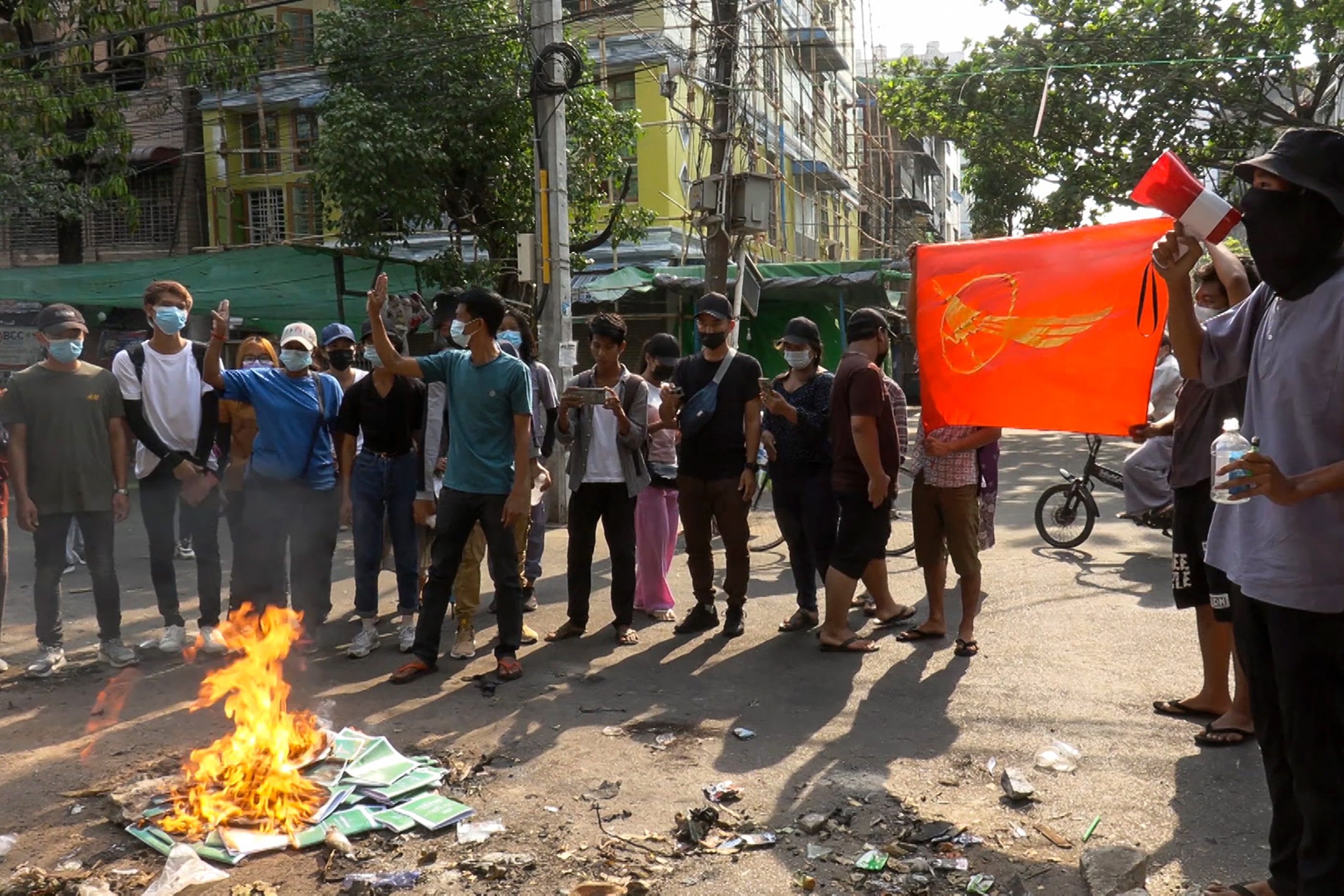 On Thursday, protesters again took to the streets of cities across Myanmar, defying a security force crackdown that has killed at least 536 people. Activists burned copies of a military-framed constitution in protest against Senior General Min Aung Hlaing’s power grab.