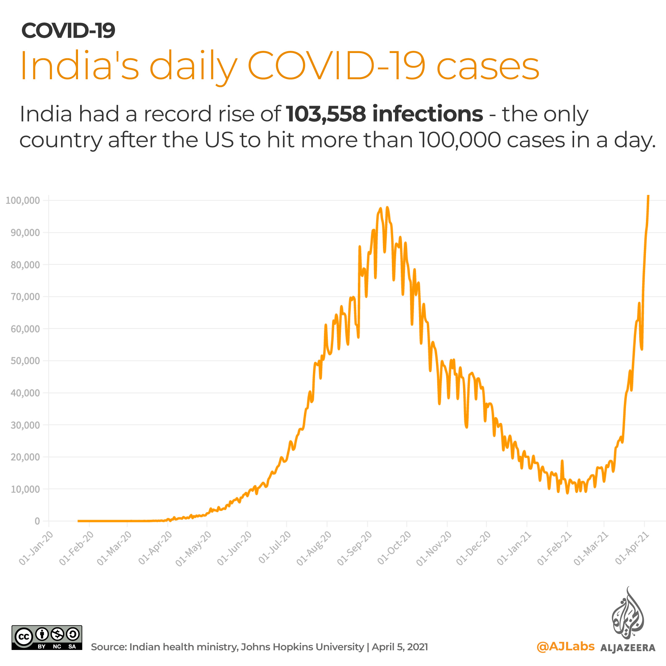With record rise of 103,558 infections, India becomes only the second country after the US to register more than 100,000 new cases in a day.