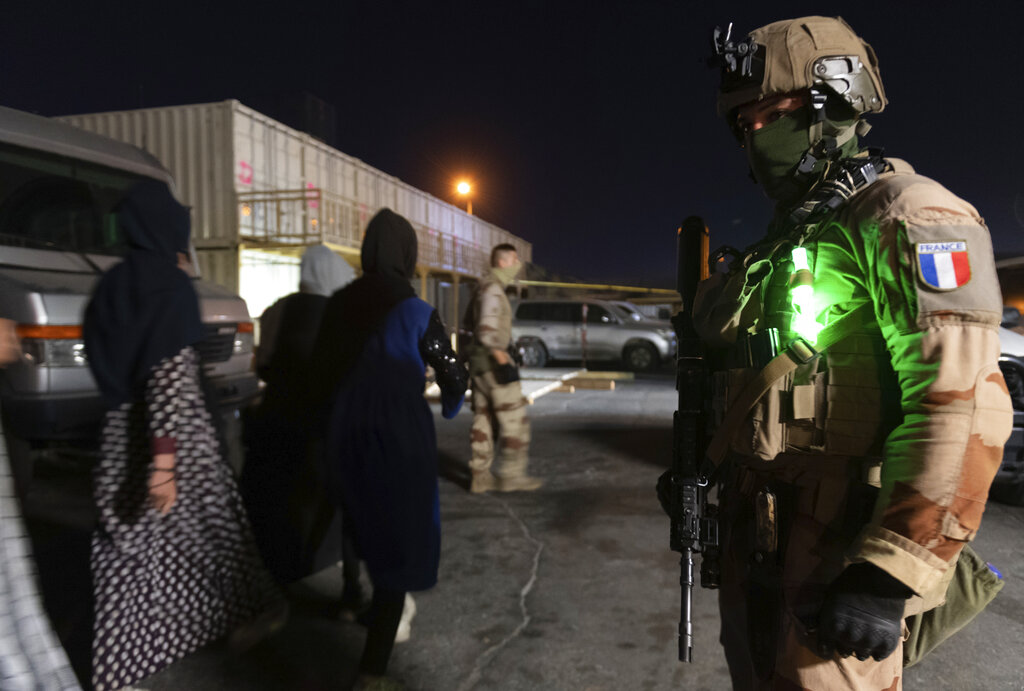 A French soldier with Afghan civilians at Kabul airport, August 20 [Etat-Major des Armees via AP]