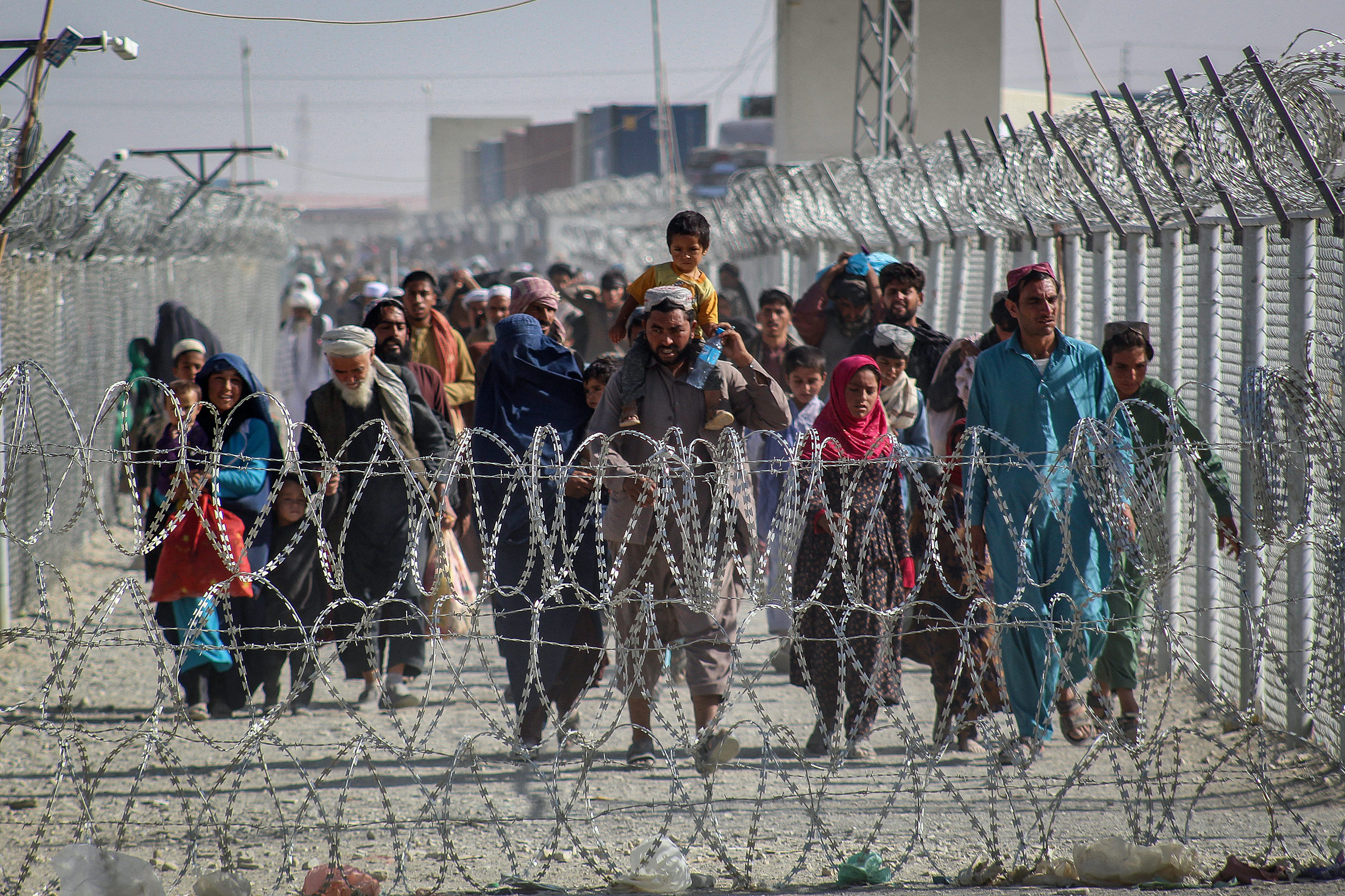 A Pakistani soldier stands guard as Afghans walk along fences after arriving in Pakistan through the Pakistan-Afghanistan border crossing point in Chaman [AFP]
