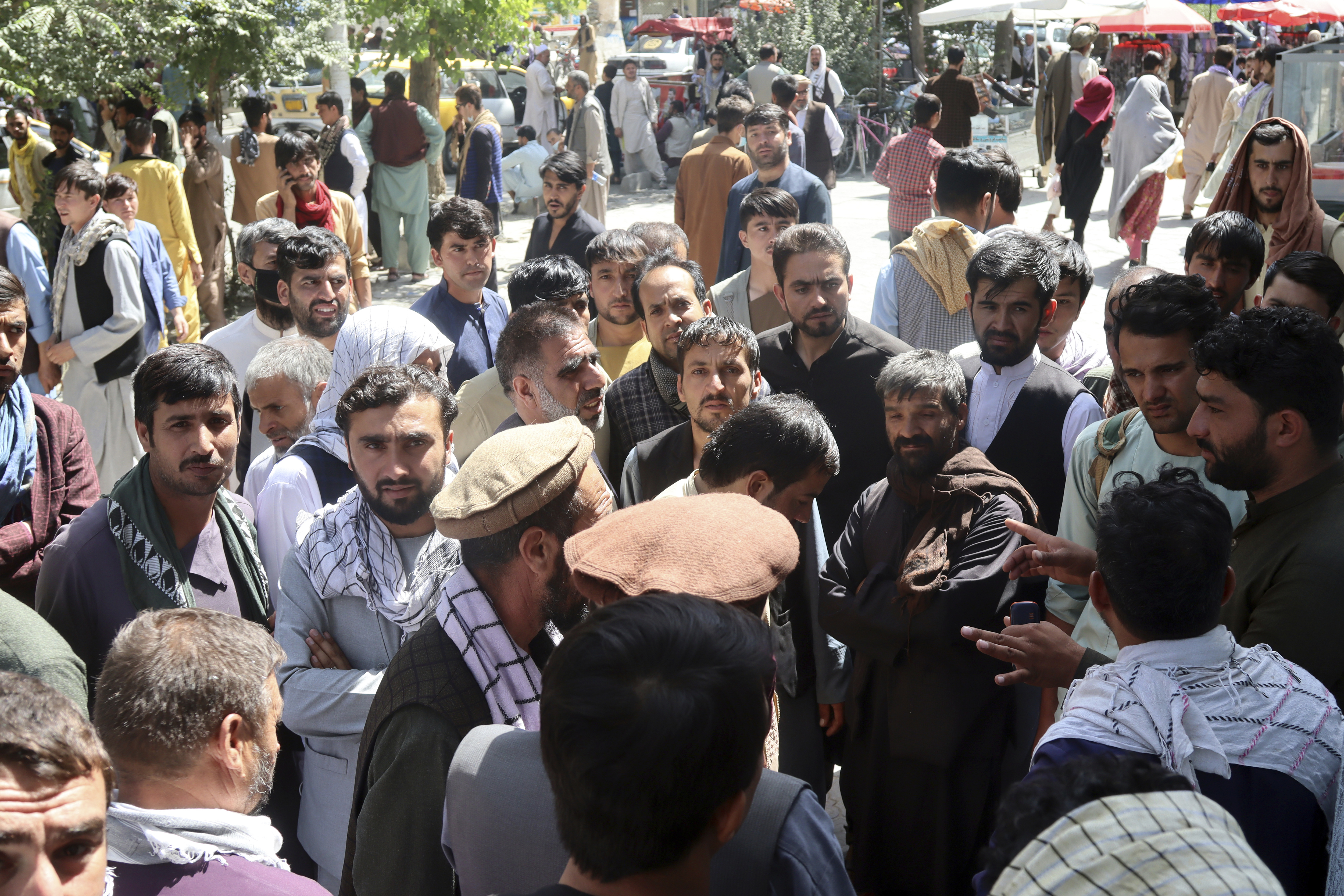 Hundreds of Afghans have protested outside a bank in Kabul as others formed long lines at cash machines.