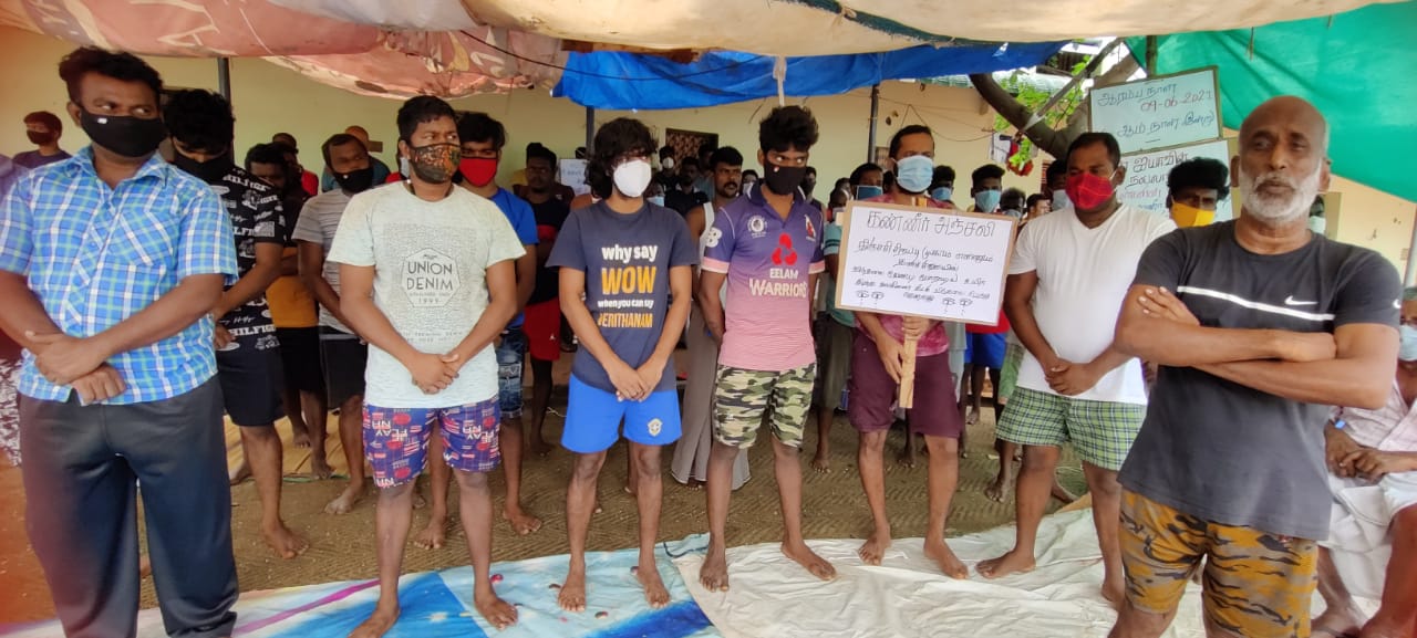Nearly 80 Sri Lankan Tamils have been conducting a relay protest for weeks now behind the barbed-wire fence at the prison, demanding their release and alleging false detention.