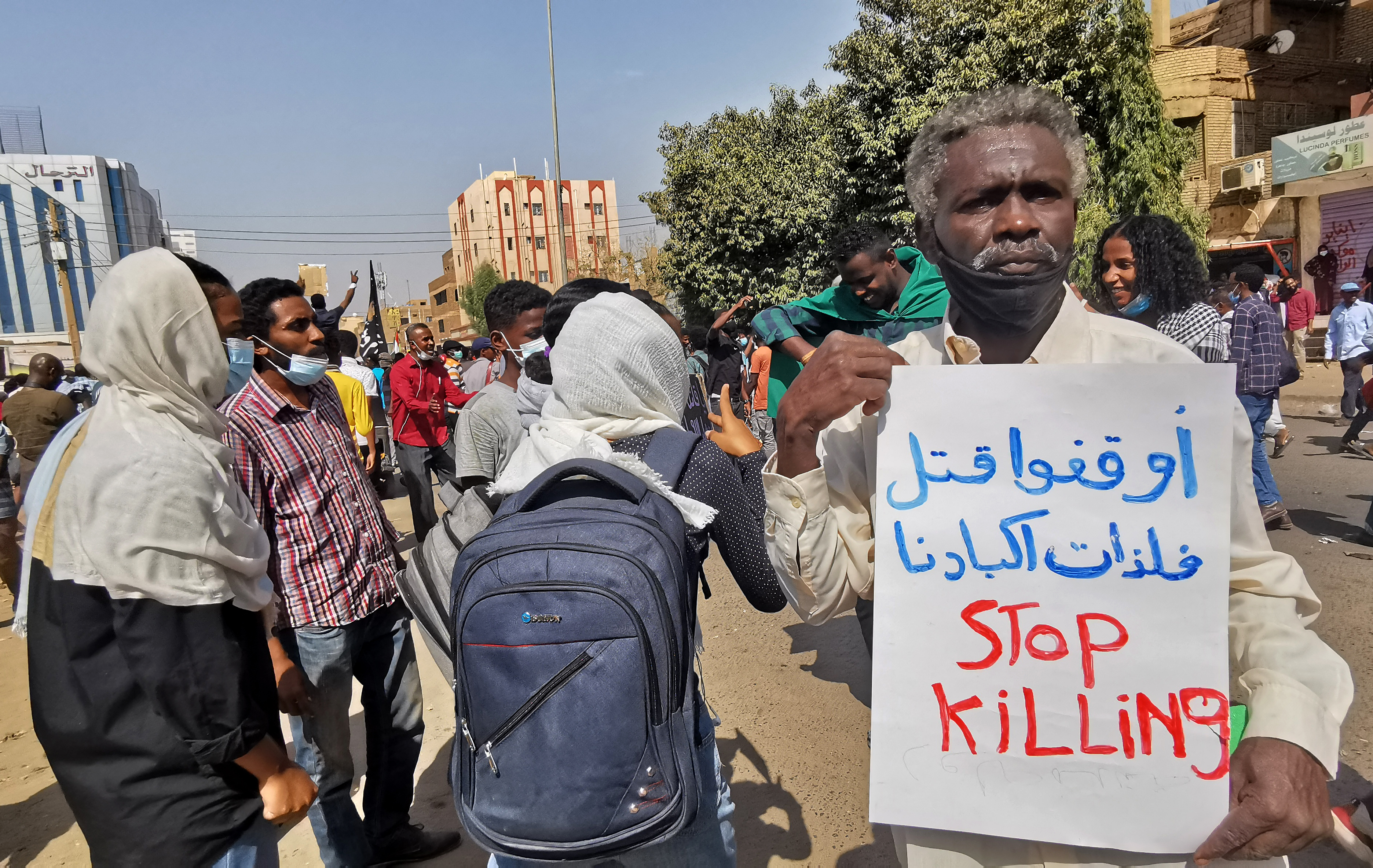 A Sudanese protester holds a sign that says in English and Arabic 'Stop Killling'