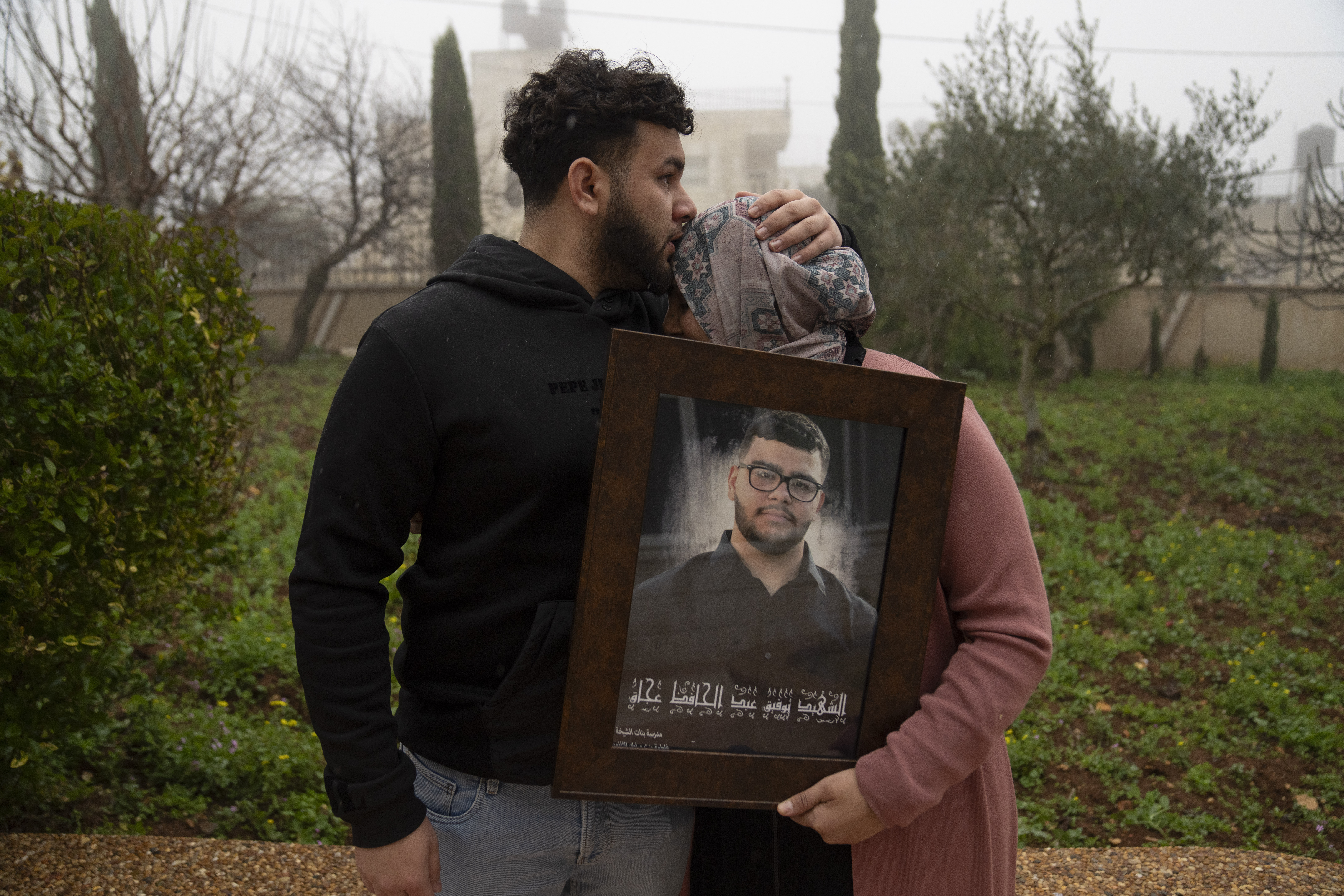 Ajaq's older brother, Amir, comforts his mother Mona in the village of al-Mazra'a ash-Sharqiya in the occupied West Bank [Nasser Nasser/AP Photo]
