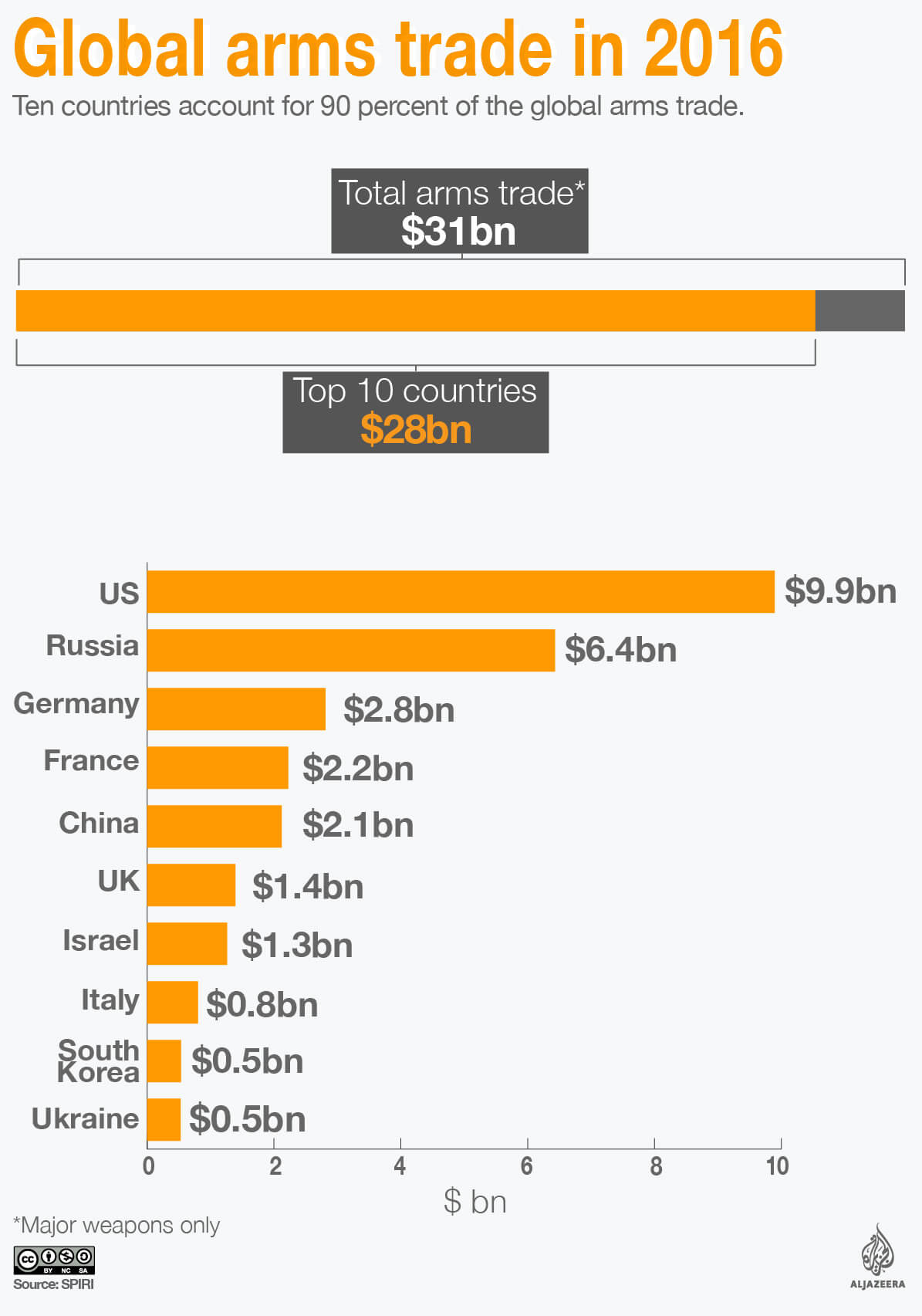 The growing demand for conventional weapons is making many providers very wealthy. The top 100 arms companies have sold over $5 trillion worth of merchandise since 2002. In 2016, some $31bn was generated by the international arms trade, the US earning $9.9bn of it, followed by Russia with $6.4bn and Germany with $2.8bn.