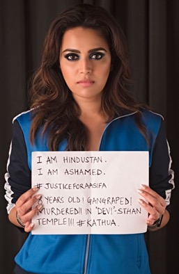 Bollywood celebrities joined the movement by circulating photos of themselves holding the placard, “I am Hindustan. I am ashamed. #JusticeForAasifa. 8 years old. Gangraped. Murdered. In ‘Devi’-sthaan Temple. #Kathua.” Swara Bhasker too participated by tweeting this placard.