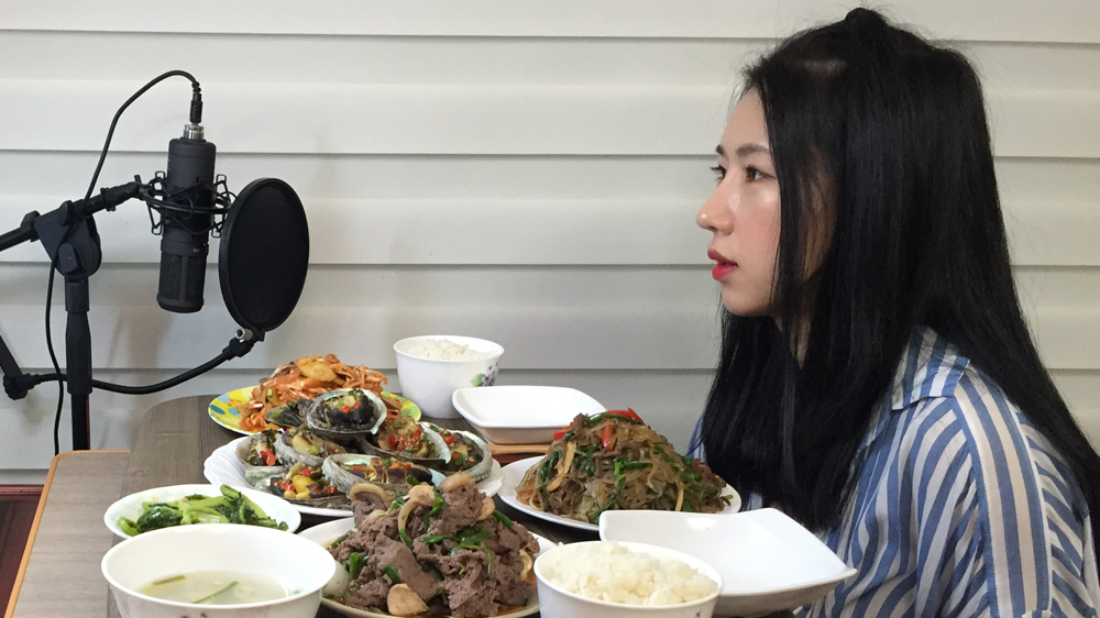 Each night, she eats enough for three people in front of a webcam watched by thousands of viewers.