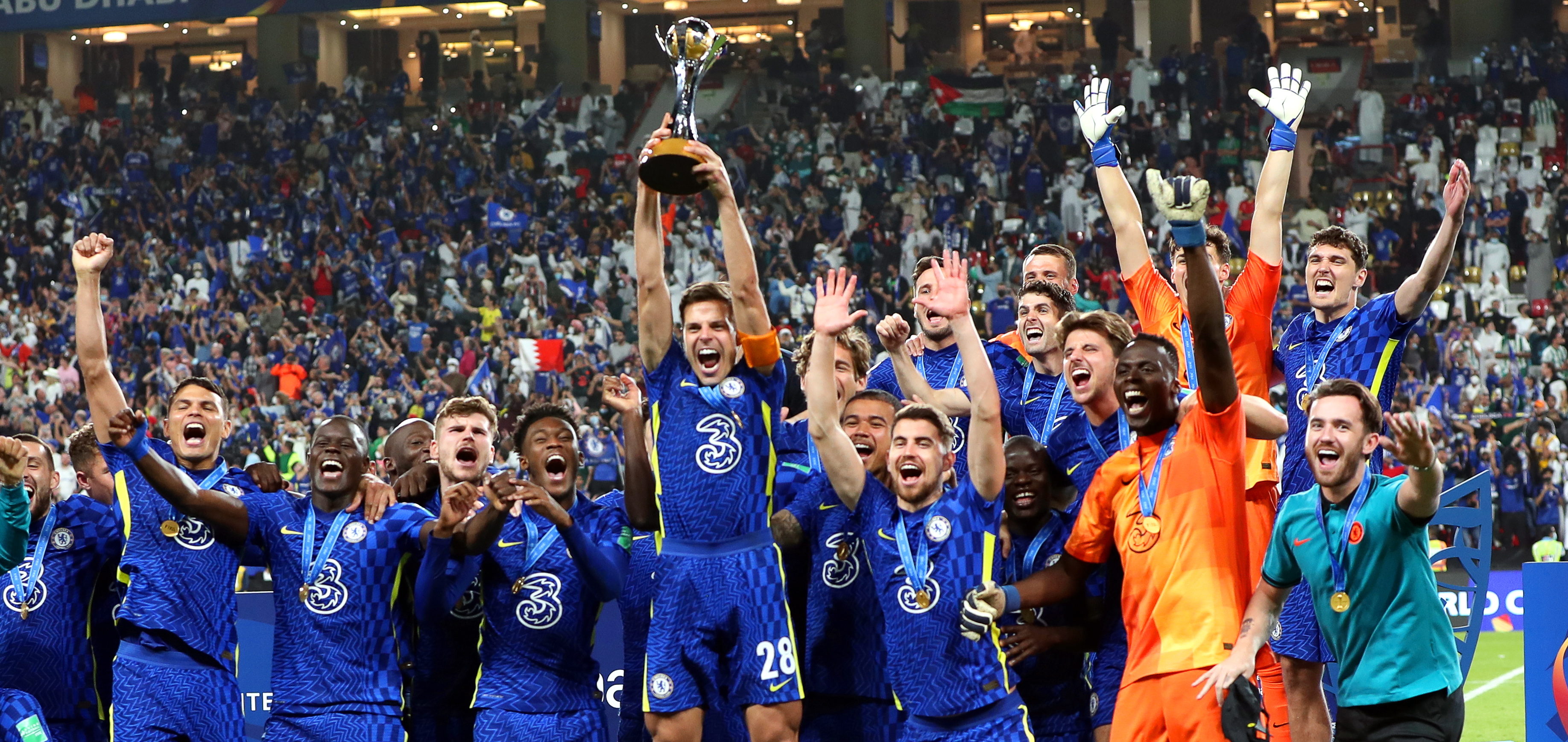 Chelsea's captain Cesar Azpilicueta lifts the trophy as his teammates celebrate after winning the FIFA Club World Cup final against SE Palmeiras in Abu Dhabi, UAE on Saturday [Ali Haider/ EPA-EFE]